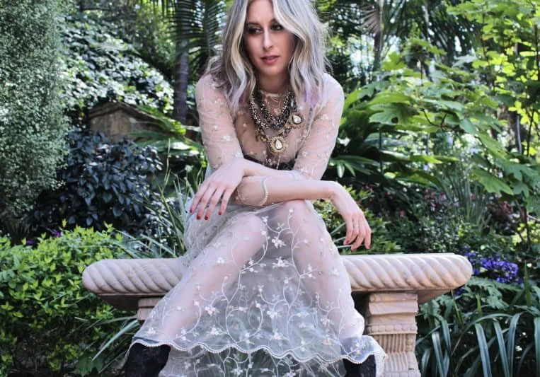 A woman with blonde, wavy hair sitting on a stone bench surrounded by lush greenery, wearing a sheer embroidered dress and layered necklaces.